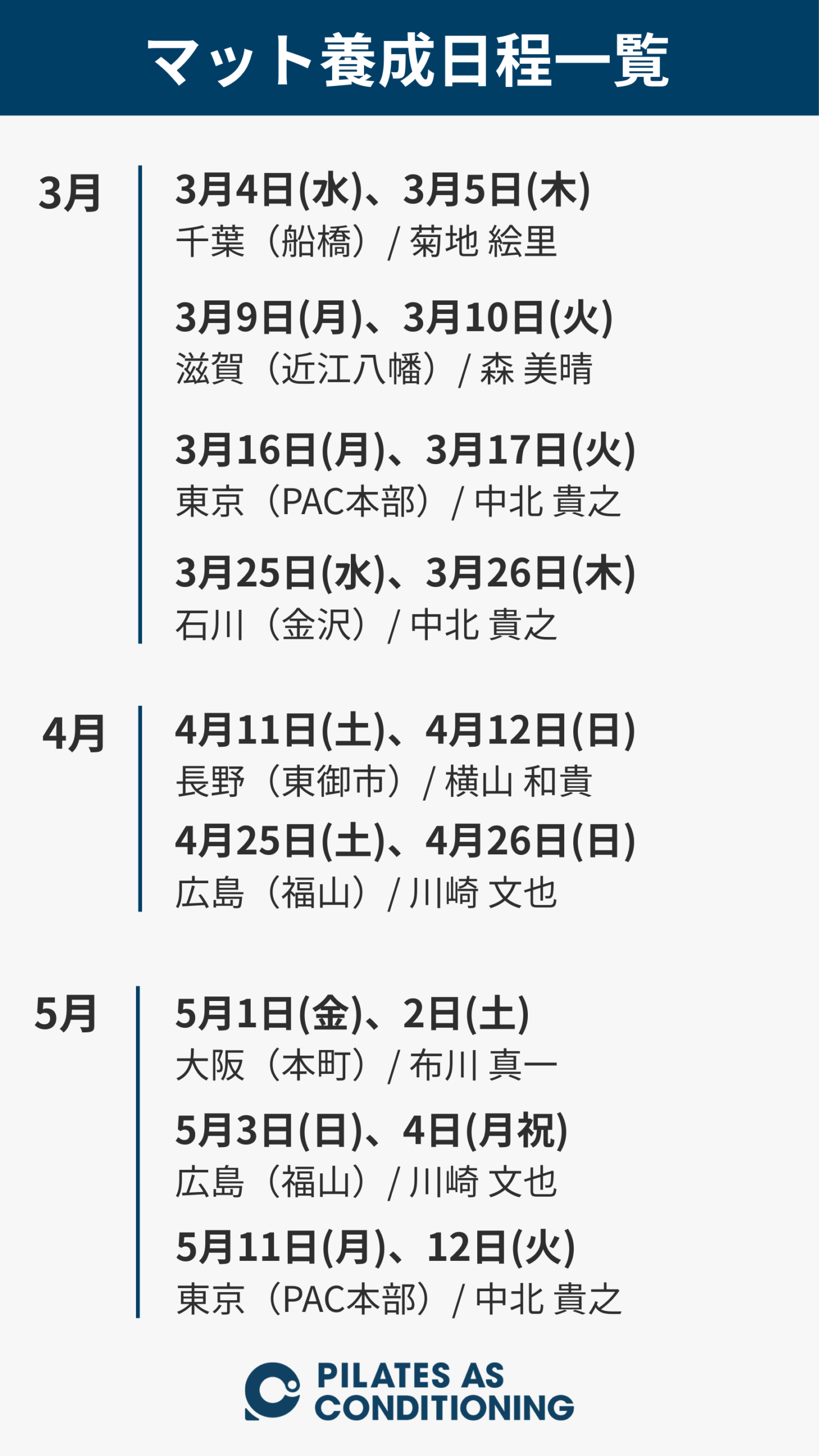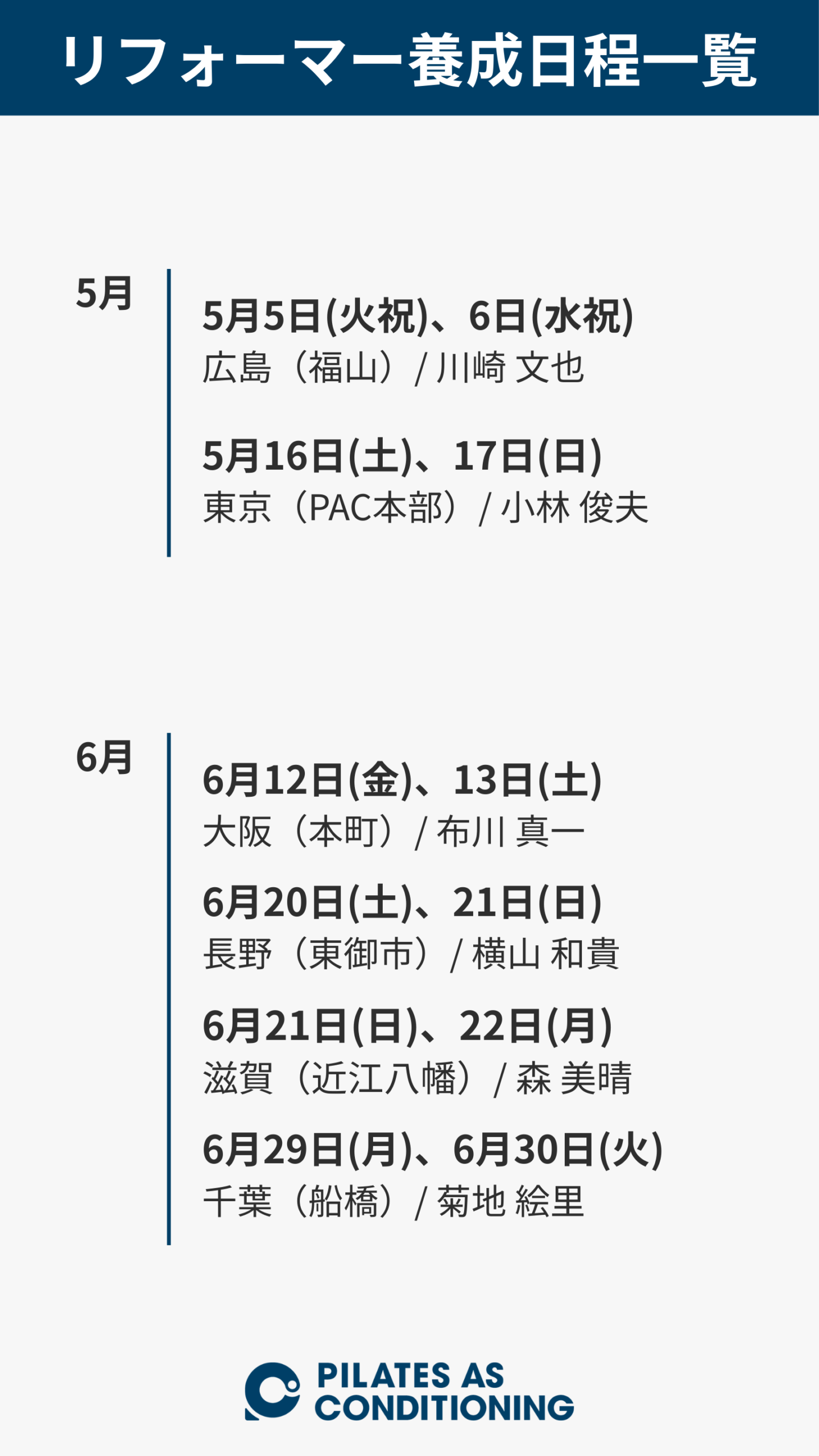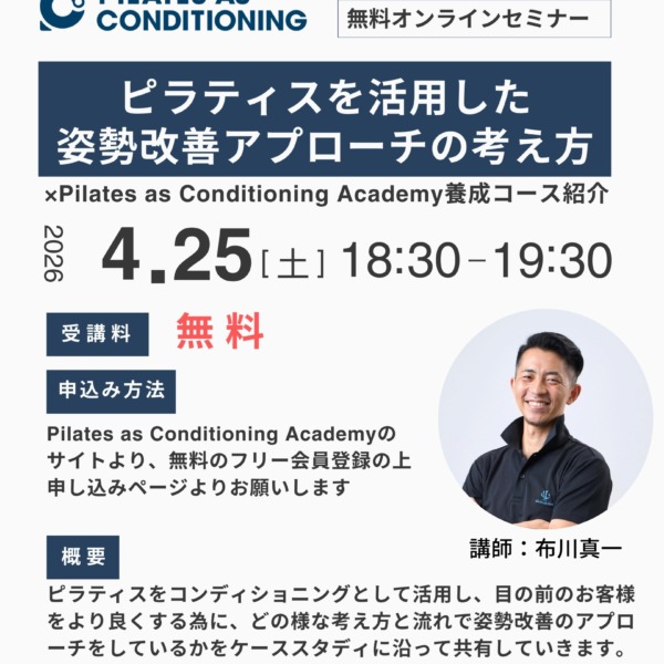 Pilates as Conditioningは、従来のピラティスの考え方だけではなく、最新のコンディショニング理論や医科学的知識、15年以上にわたる指導・育成経験、多くの方からの学びを融合して開発致しました。現代のライフスタイルや現代人の特徴に合わせたコンディショニング理論と多角的な評価に基づき、安全に身体の変化を楽しんで頂きながら、目の前のお客様をより良く出来ます。