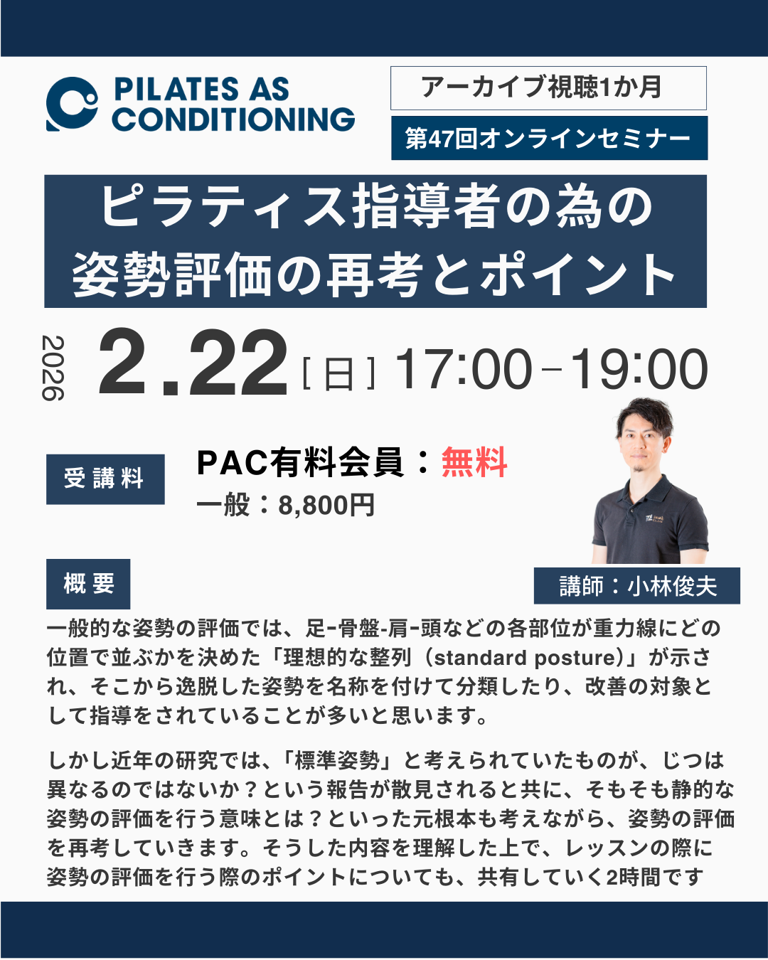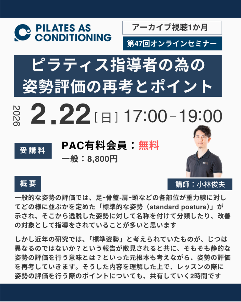※2026年2月21日までに、Pilates as conditioning Academyに有料会員登録頂ければ、無料でLiveセミナーを視聴頂けます。