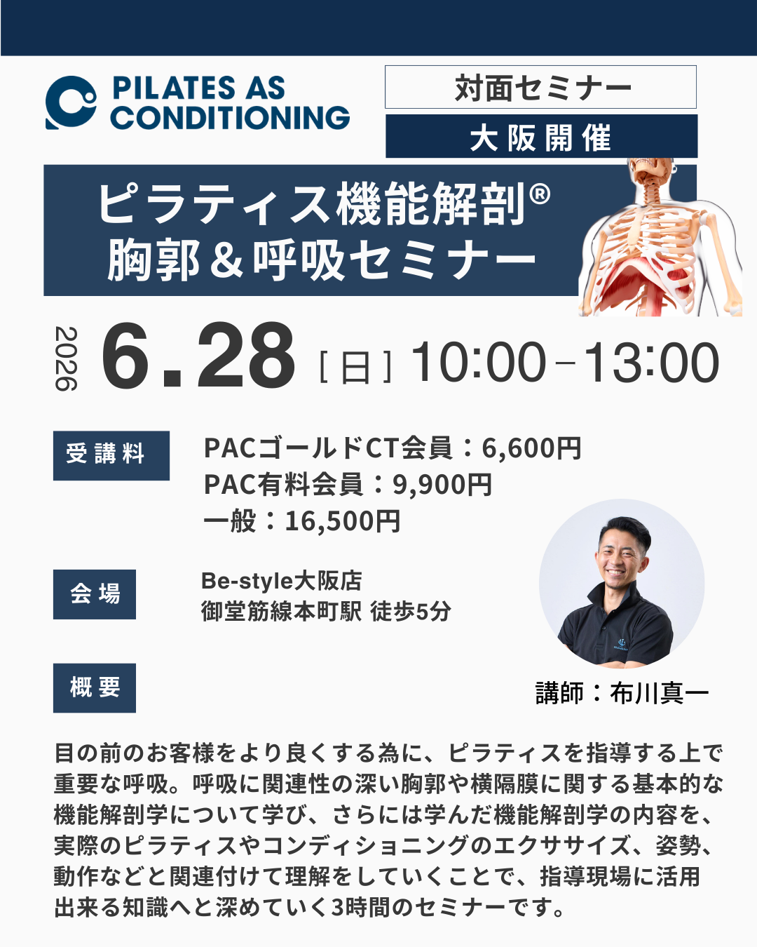 大阪(本町)開催:6月28日(日)ピラティス機能解剖® 胸郭&呼吸セミナー