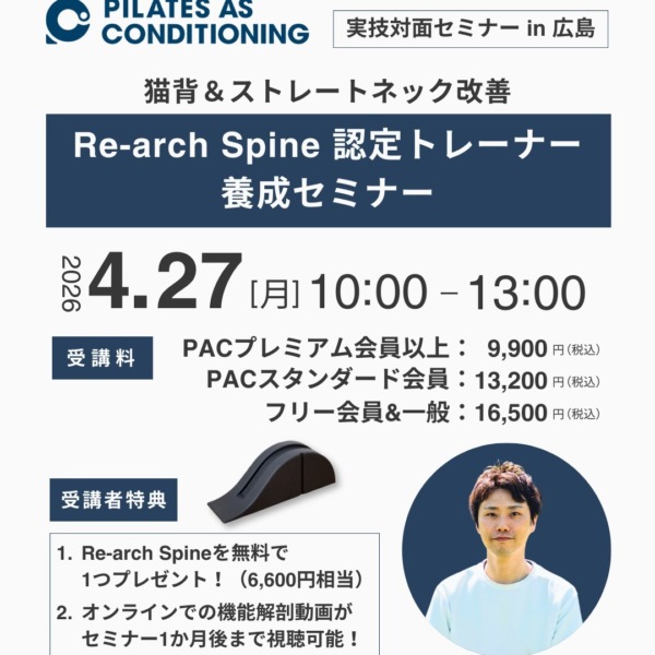 同日の10:00~13:00に同じ会場で、「Re-arch Spine 認定トレーナー養成セミナー」を開催しますので、併せてご参加をお待ちしております!