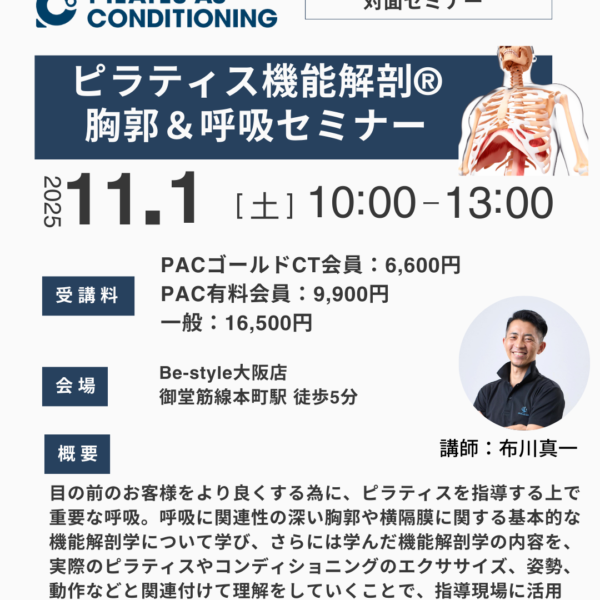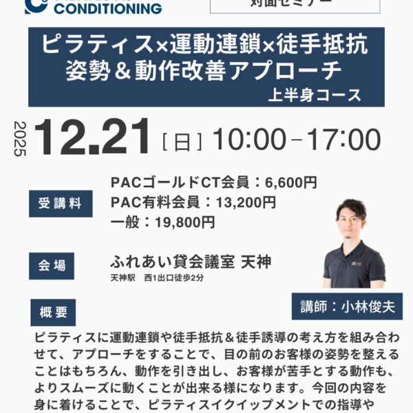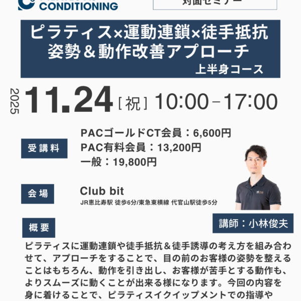 1Dayセミナー 2025.10.02 東京開催:11月24日(月祝):ピラティス×運動連鎖×徒手抵抗による姿勢&動作改善... 【ピラティス×運動連鎖×徒手抵抗】 目の前のお客様の姿勢や動作を改善... 130