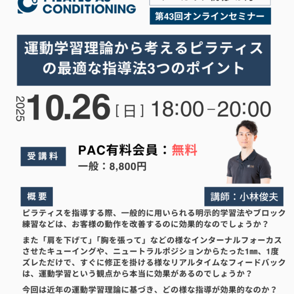 1Dayセミナー 2025.10.01 10月オンラインセミナー:運動学習理論から考えるピラティスの最適な指導法3つのポ... 運動学習理論から考えるピラティスの最適な指導法3つのポイント 日時:2... 70