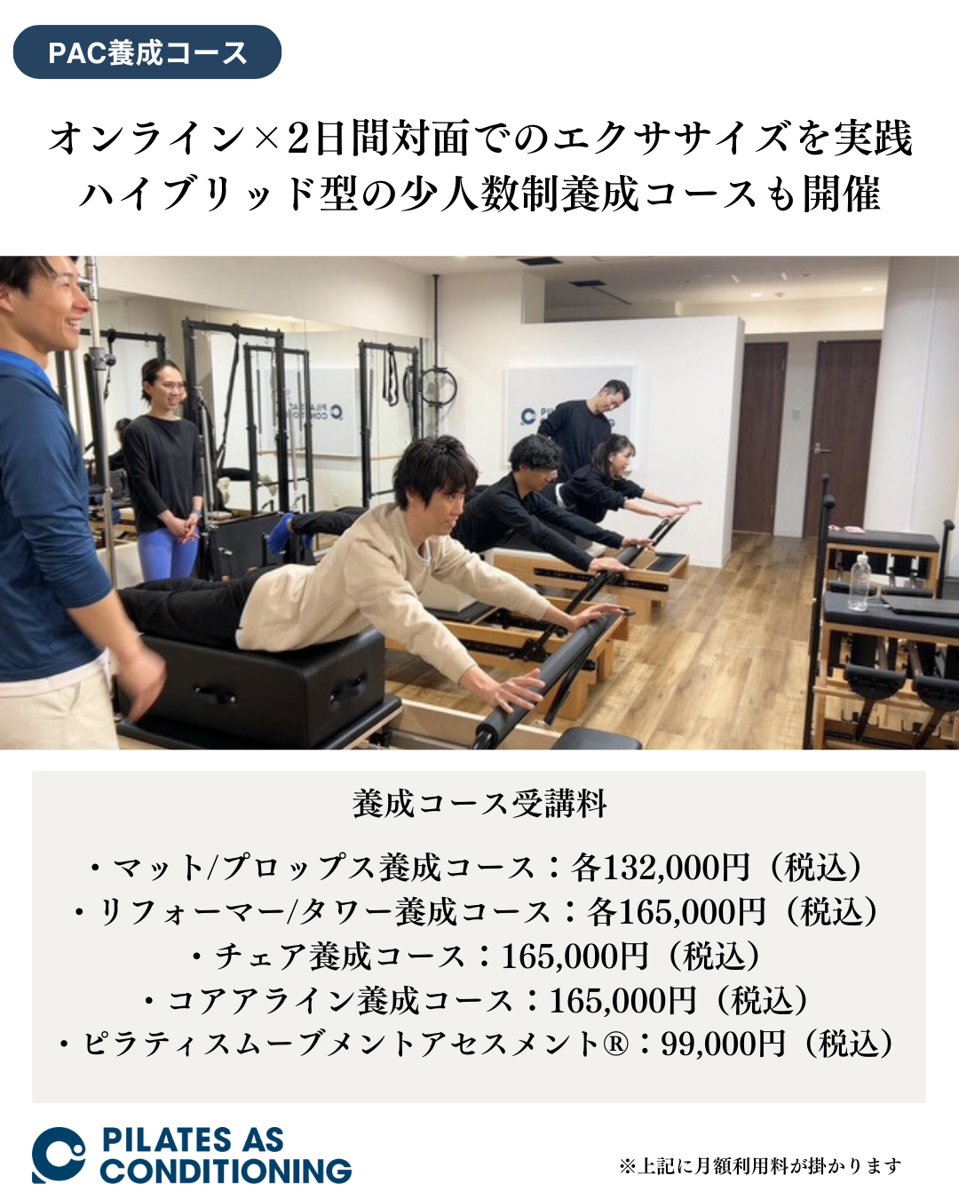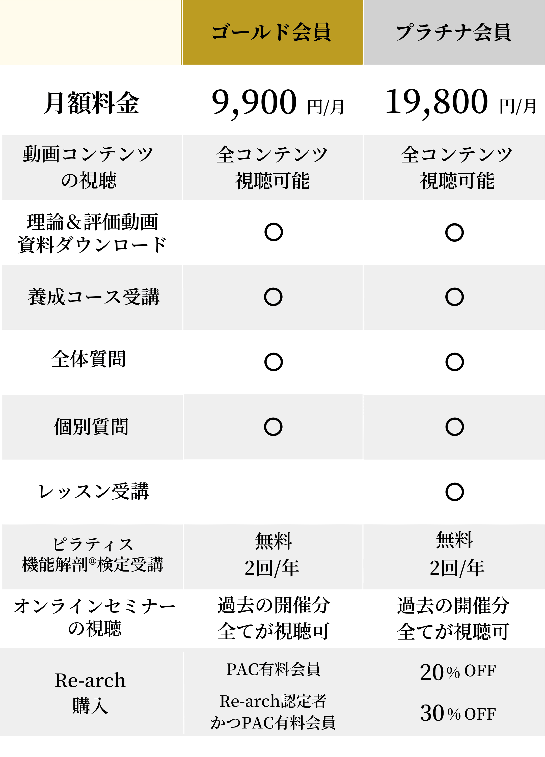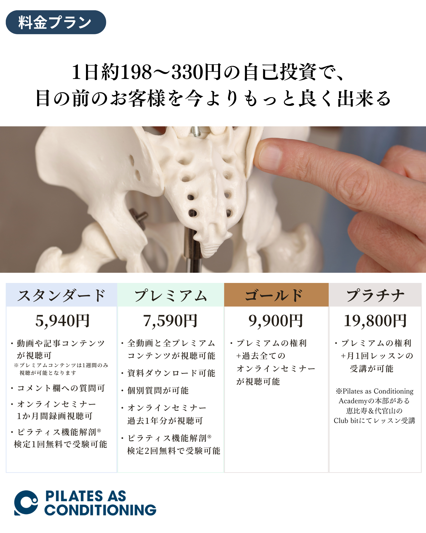 ※ Pilates as conditioning認定資格の維持には、スタンダード会員以上のサービスを通した継続学習が必須となります。